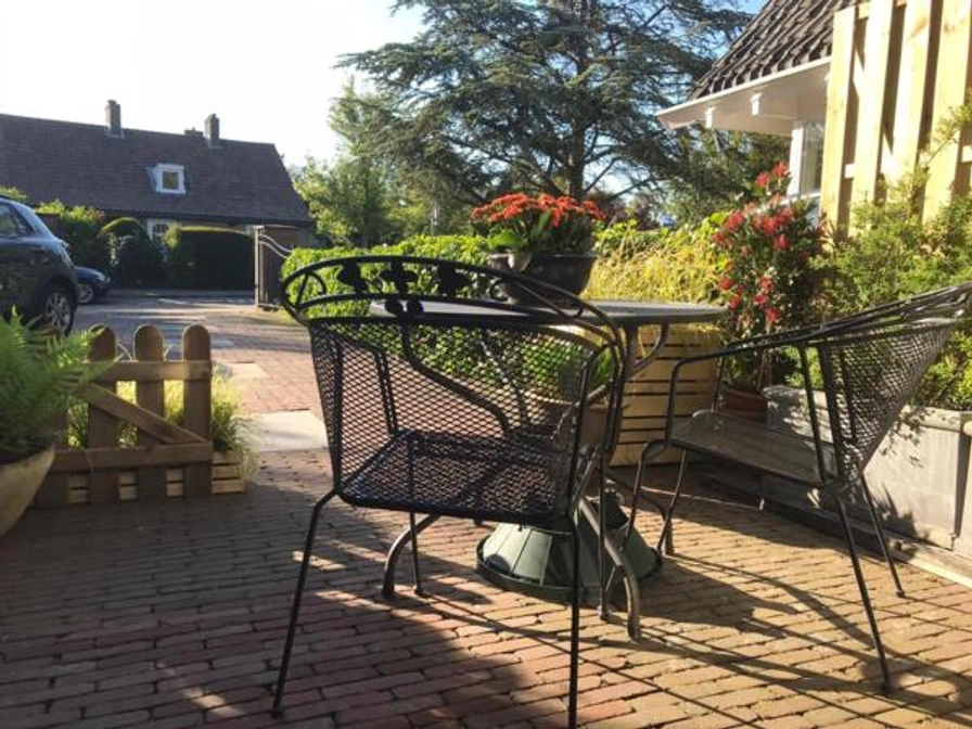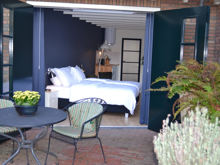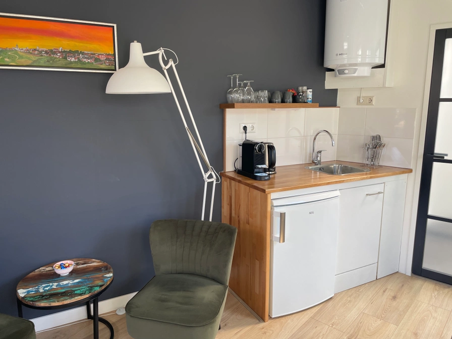 The studio has 2 single beds (90x200), Smart TV, WiFi and the kitchenette is equipped with coffee and tea facilities, refrigerator, crockery, cutlery, sandwich maker, egg cooker and an orange juicer. Outside there is a terrace with a seat and you can park your car for free on the property at the accommodation.